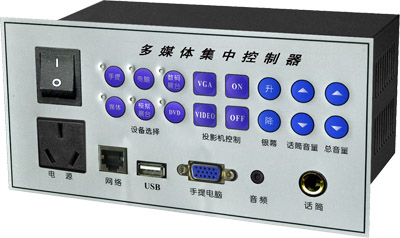 • ▲ 單鍵開關機:使用中控時,按下電源,中控進入使用狀態,使用結束,關閉電源開關,其它如關投影機、升銀幕、延時散熱、切斷全部電源等均由中控自動完成。
