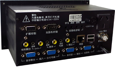 • ▲ 單鍵開關機:使用中控時,按下電源,中控進入使用狀態,使用結束,關閉電源開關,其它如關投影機、升銀幕、延時散熱、切斷全部電源等均由中控自動完成。