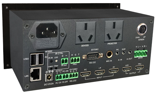 4路HDMI信號輸入,分辨率1920*1080 2路HDMI矩陣切換快速輸出 4路音頻信號同步輸入,1路音頻信號切換輸出 USB長線白板驅動 3路RS232輸出,可控制投影機、電視機等設備 3路強電輸出,可供投影機、銀幕及電腦等設備。 1路紅外控制輸出 具有線路數字音量控制 具有話筒數字音量控制 可擴展2*50W數字功放輸出