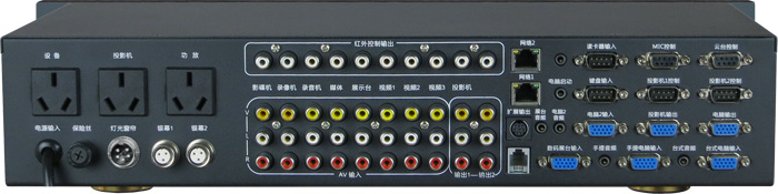 4 路VGA(臺(tái)式電腦、筆記本電腦、數(shù)字展示臺(tái)、臺(tái)式電腦2)輸入,2 路矩陣輸出,1920×1440點(diǎn)/85Hz |