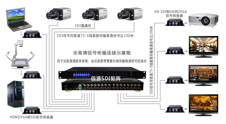 用HDMI轉SDI,傳輸線纜采用普通視頻線,再由SDI轉HDMI連接顯示設備(如投影機、大屏幕電視機、顯示器)是解決既要長距離傳輸又要達到高清圖像,不失為較好的解決方法。